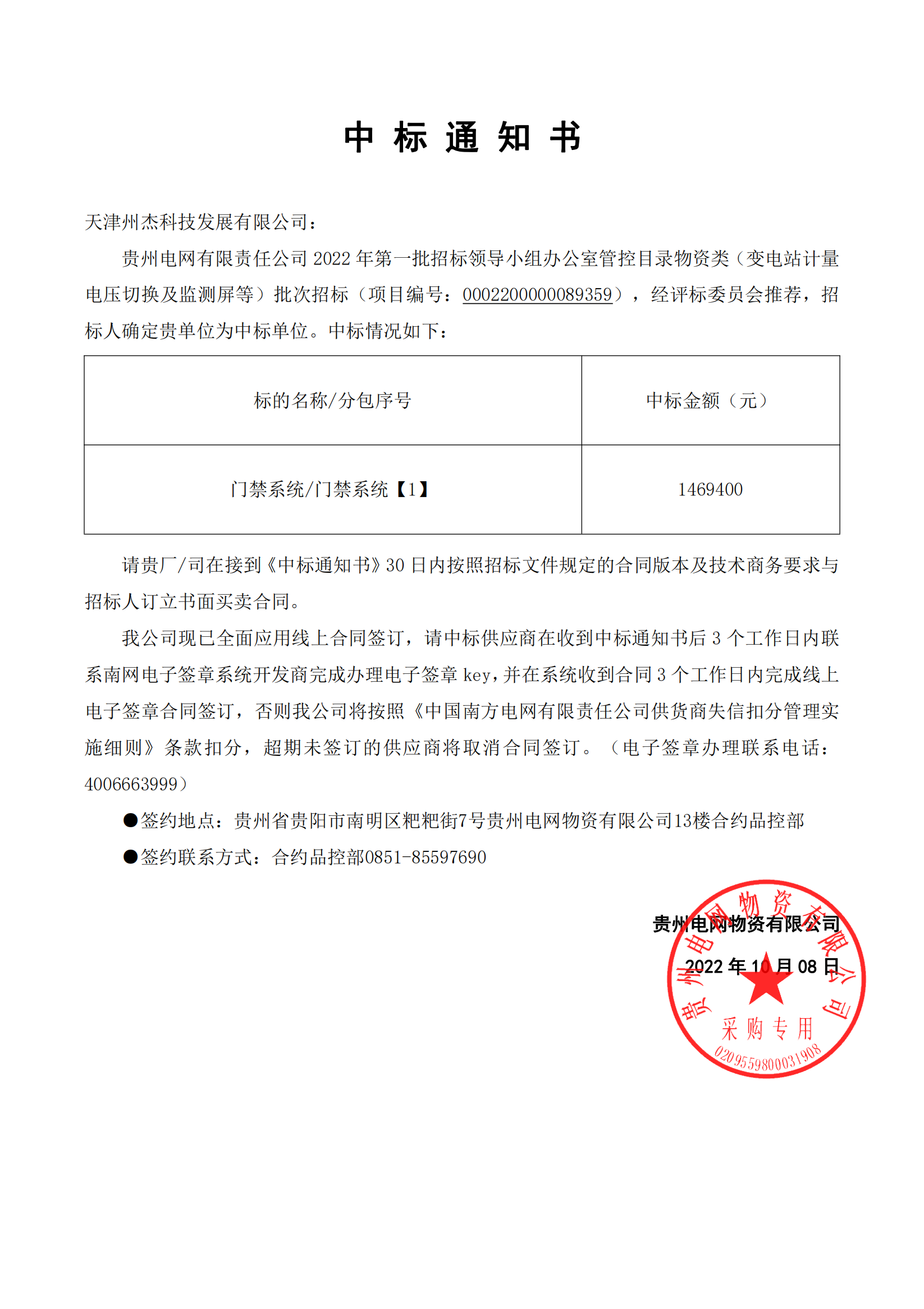【概要描述】天津州杰科技發(fā)展有限公司中標(biāo)貴州電網(wǎng)有限責(zé)任公司2022年第一批招標(biāo)領(lǐng)導(dǎo)小組辦公室管控目錄物資類(變電站計(jì)量電壓切換及監(jiān)測屏等)批次招標(biāo)(項(xiàng)目編號碼0002200000089359),經(jīng)評標(biāo)委員會推薦,招標(biāo)人確定貴單位為中標(biāo)單位。中標(biāo)情況如下: